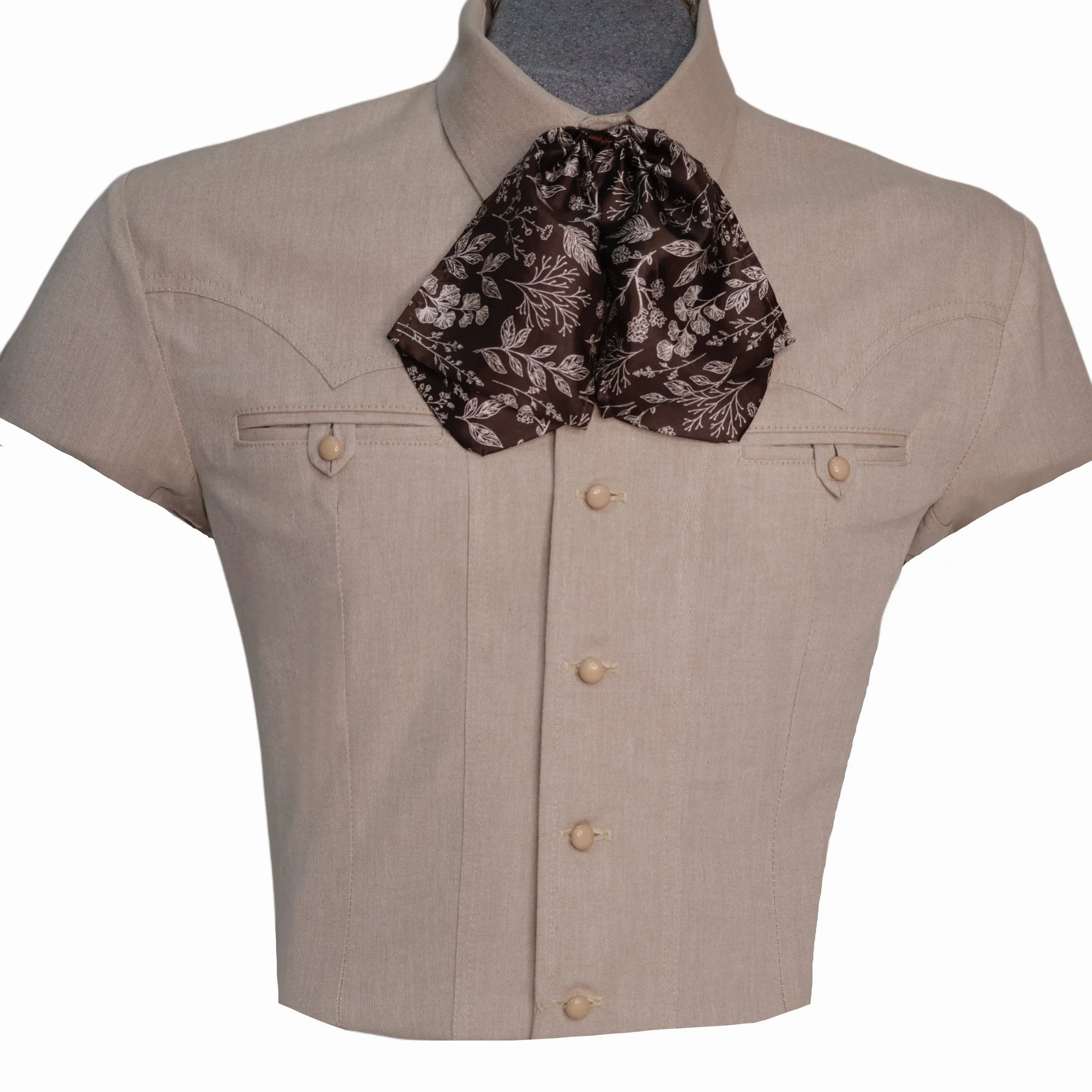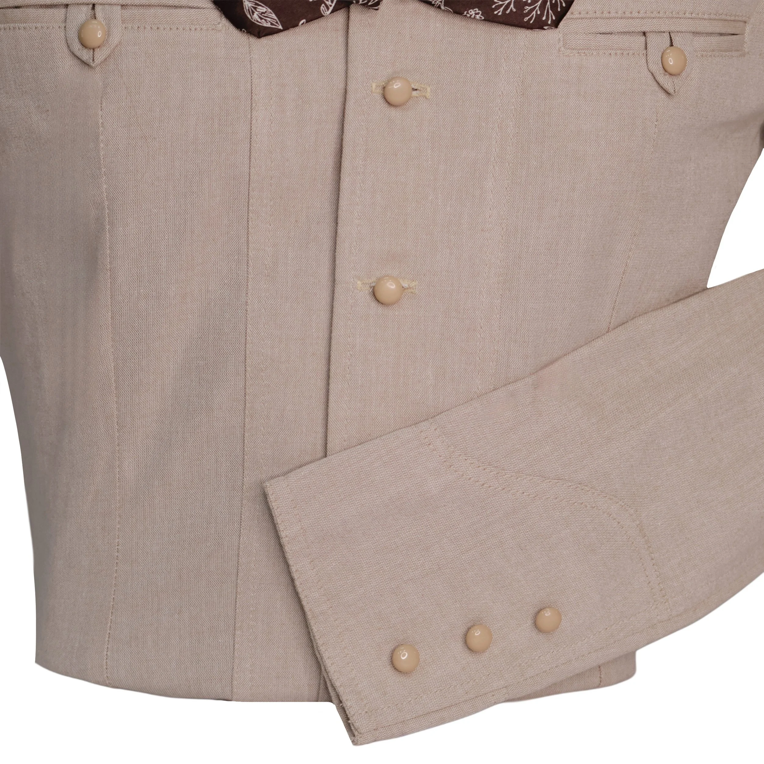 Traje de charro de faena, color beige, con greca de gamuza café.